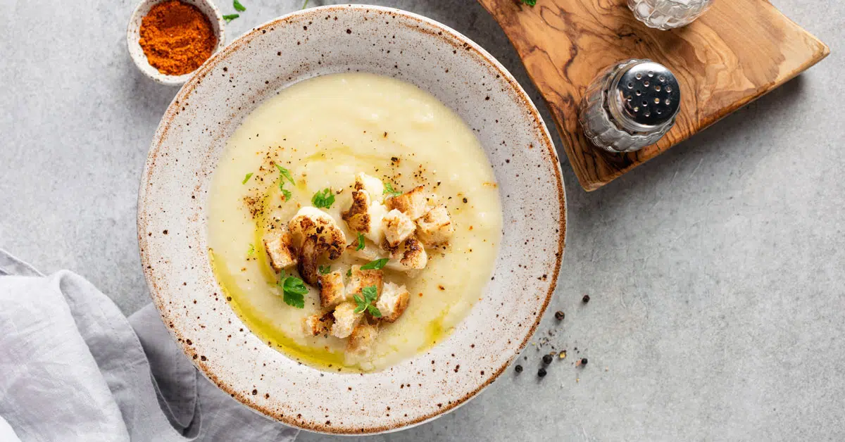 - Retirez la casserole du feu et laissez le chou-fleur tiédir un peu. À l’aide d’un mixeur plongeant ou dans un blender, mixez le tout jusqu’à obtenir une consistance lisse et crémeuse. Remettez la soupe mixée dans la casserole, salez et poivrez à votre goût. Incorporez la crème liquide au velouté et chauffez doucement sans laisser bouillir.
