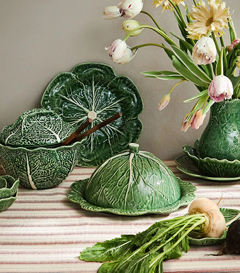La fascination pour le chou comme motif décoratif n’est d’ailleurs pas nouvelle. Les racines de la tendance remontent à 1884, lorsque le céramiste portugais Rafael Bordallo Pinheiro imagine un service en majolique inspiré des feuilles de chou. Ses assiettes et plats, reconnaissables à leurs nervures marquées et à leur émail vert brillant, deviennent rapidement des pièces iconiques.