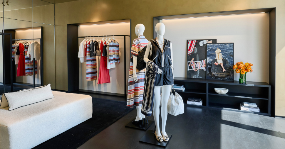 Pas de démonstration ostentatoire ici. La façade joue la carte de la discrétion, presque inattendue. À l’intérieur, les codes feutrés de Chanel restent intacts, ponctués de nuances estivales. Sable, noir, blanc — le trio signature — relevé par quelques accents plus vibrants.