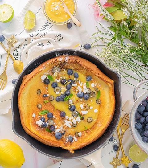 Pancakes au fromage frais, myrtilles et sirop d’érable