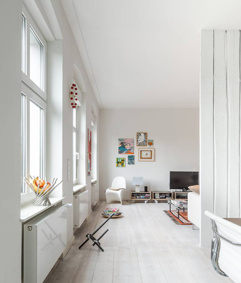 De architecten van het Duitse Karhard creรซerden extra woonruimtes in dit vrij open appartement in het hart van Berlijn door middel van een centrale scheidingswand, uit dikke verticale planken. Aan de witte basis werden met behulp van accentmuren en budgetvriendelijke kleurmakers (magazines en boeken doen vaak al genoeg) frisse toetsen toegevoegd. Laat je inspireren.
