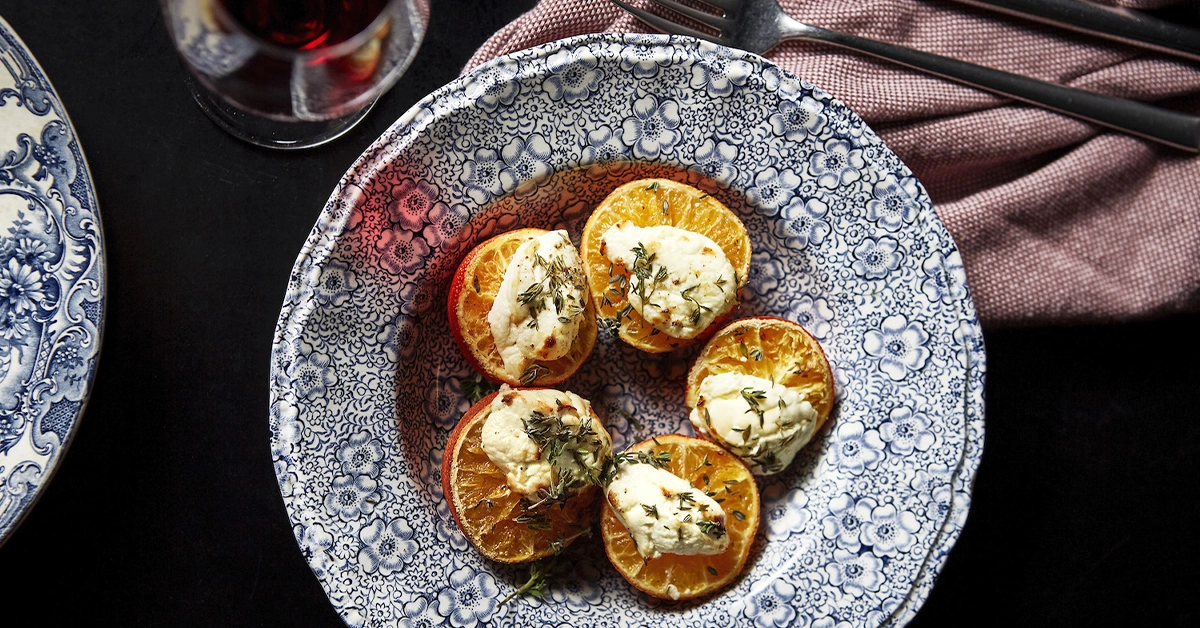- Leg ze op een ovenplaat en verbrokkel de geitenkaas op de halve mandarijntjes. Voeg een scheutje olijfolie toe en driekwart van de verse tijm. Kruid met peper en zout.