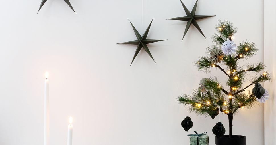 Voor de versiering van de kleine boom hebben we deze fijne papieren ornamenten uitgekozen, een trendy item oorspronkelijk afkomstig uit de Scandinavische landen. We combineerden wit en verschillende tinten groen met twee gouden kandelaars, en deze mooie groene papieren sterren aan de muur. Je vouwt de papieren sterren gewoon open en vouwt ze weer in elkaar als het tijd is om ze op te bergen. Heel gemakkelijk.