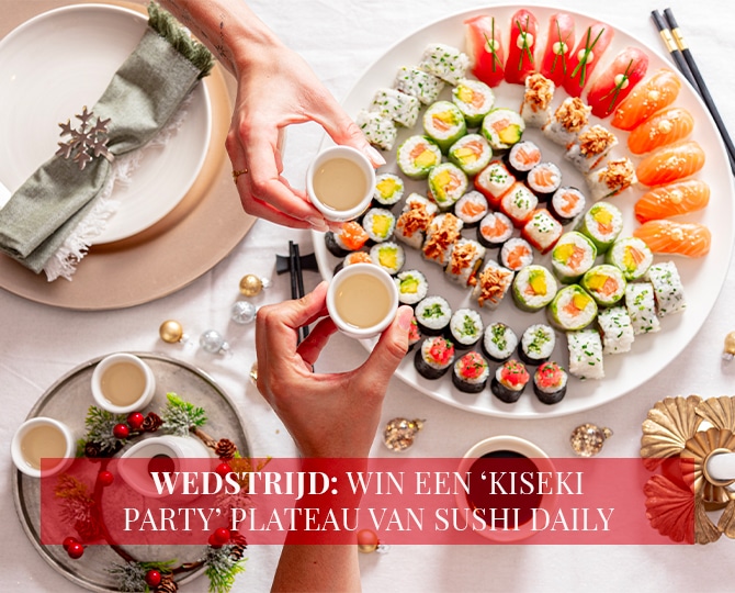 Maak kans op een sushi-uitdeelplateau Kiseki Party (65 stuks, voor 4 tot 5 personen), speciaal voor de feestdagen verkrijgbaar in een limited edition voor € 55,45! De winnaar mag zijn plateau afhalen bij een van de Sushi Daily-kiosken.
