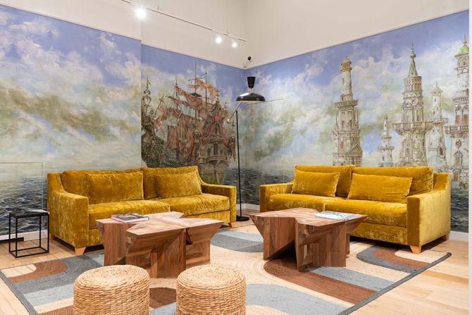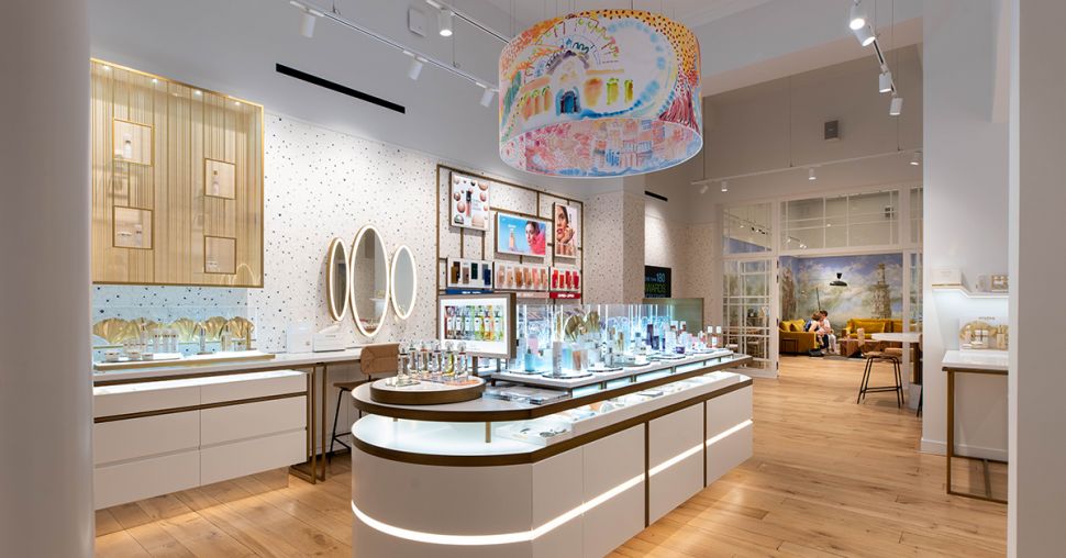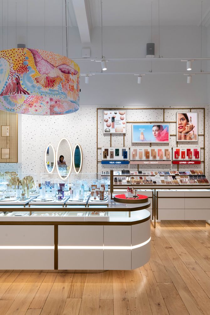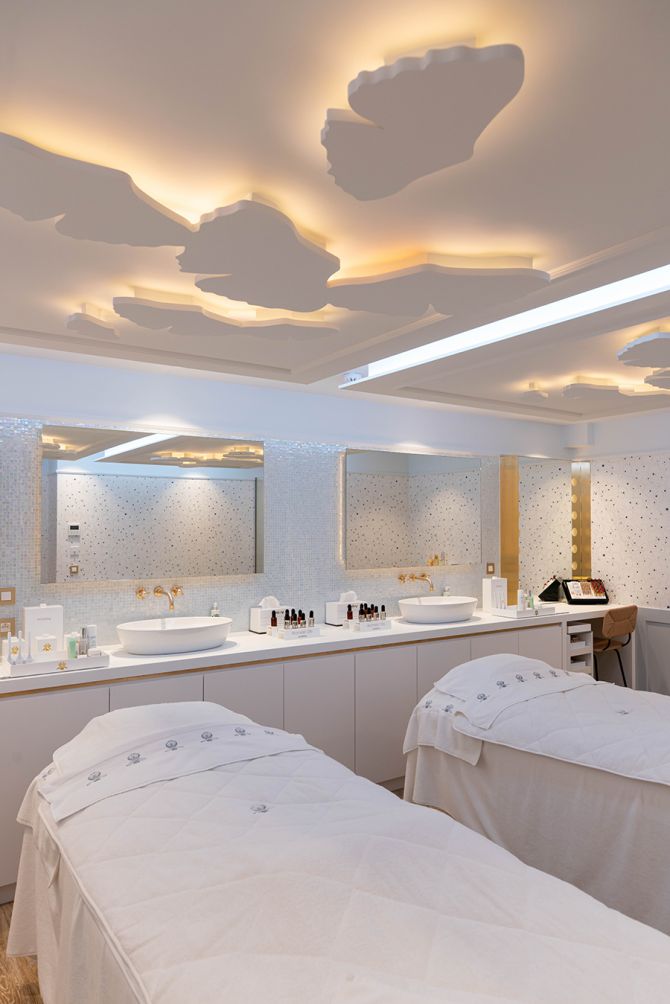 Het interieur nodigt uit tot ontspanning en creรซert een serene sfeer. Elk detail werd onder de loep genomen, zo hangen er lichtgevende silhouetten aan het plafond die de bladeren voorstellen van de gingko biloba, een iconisch antiverouderingsingrediรซnt in veel Sisley-producten.