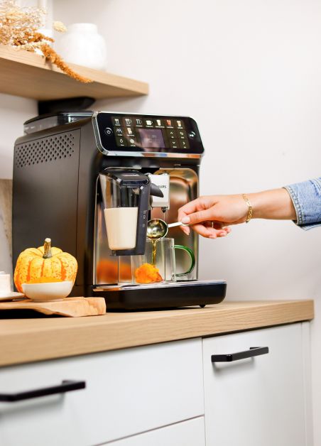 4. Selecteer de optie voor gestoomde melk op de Philips LatteGo en voeg deze bij de pumpkin spice koffie.ย
