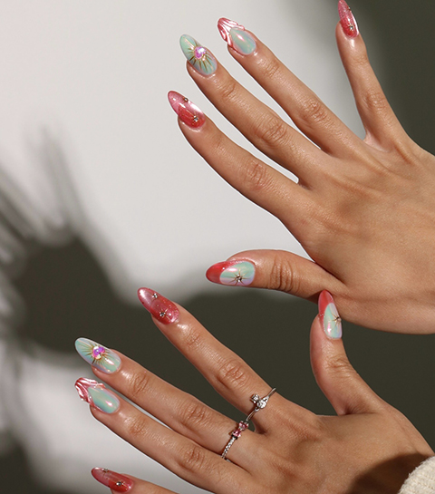 Het idee dat alle tien je nagels identiek moeten zijn, is volledig achterhaald. Mismatched nails zijn dubbel zo leuk omdat ze net spelen met contrast, denk pastel naast neon, metallic naast mat, grafische prints gecombineerd met effen tinten. Het resultaat is fun en laat tegelijk ruimte om je persoonlijkheid te tonen.