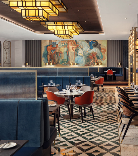 Er is รฉรฉn ruimte die het Luxembourgse gehechtheid aan deze plek belichaamt, en dat is de Brasserie Alfa. In 1932 geopend samen met het hotel, heeft het verschillende generaties van trouwe klanten zien passeren. Na een minutieuze restauratie heropent het vandaag als een waar levend eerbetoon aan zijn geschiedenis.De ogen worden onmiddellijk getrokken door het monumentale fresco van Julien Lefรจvre, dat de vier regio’s van het land voorstelt. Alles daaromheen is bedacht om het originele karakter te behouden: donkerblauwe leren banketten, een roze marmeren bar, geometrische kroonluchters, spiegels met tinnen omlijsting. Het zigzagmotief van de gevel keert subtiel terug in de vloer en het meubilair als een knipoog naar de muren.