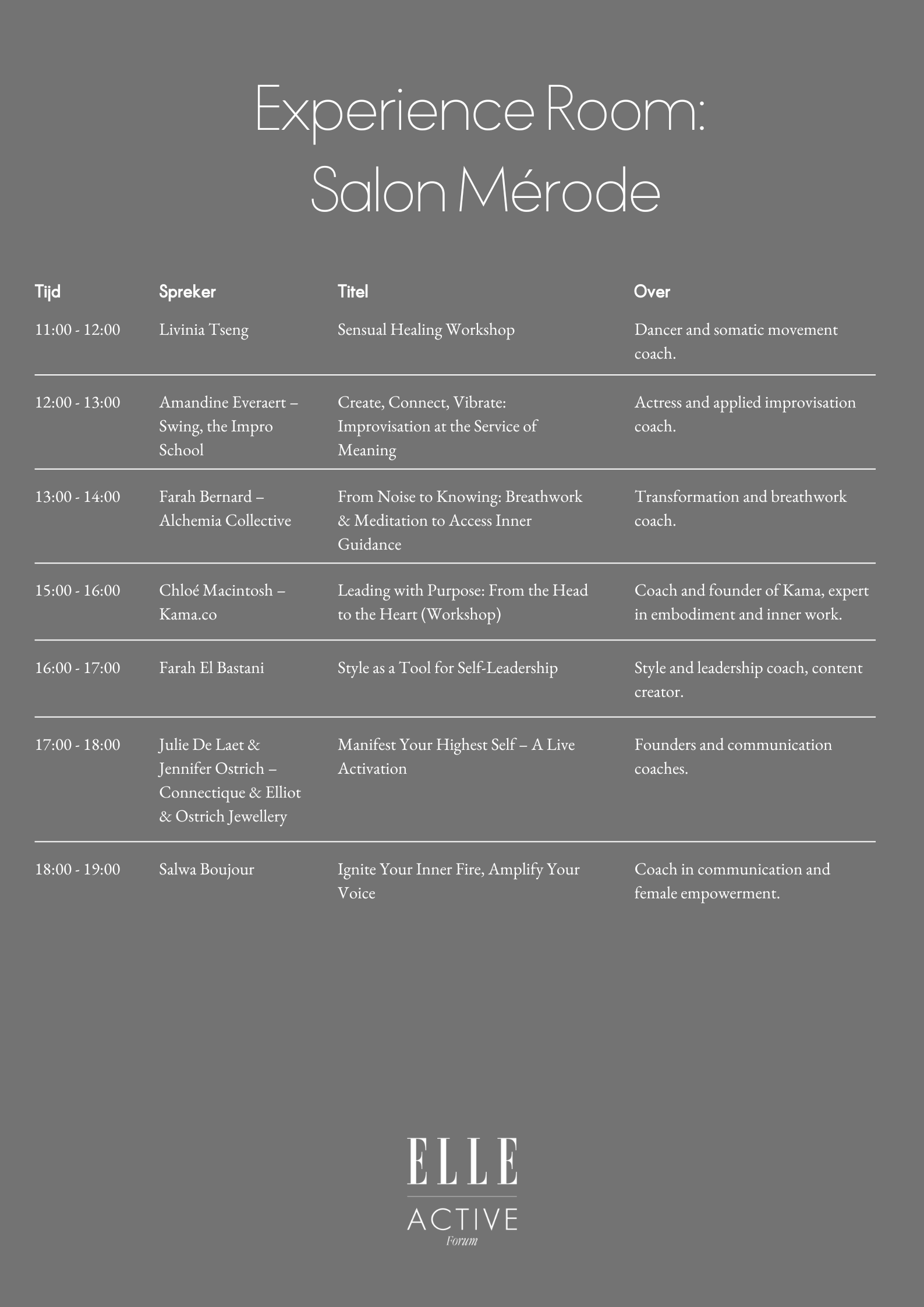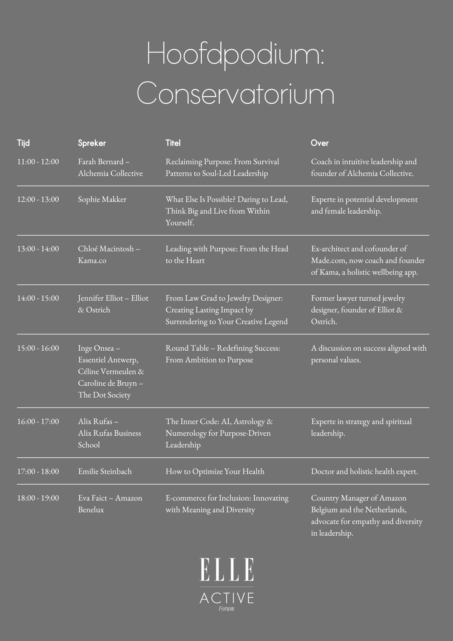 Het ELLE Active Forum keert terug op 15 november in TheMerode. Deze nieuwe editie staat in het teken van ยซ purpose ยป. Inspirerende lezingen, interactieve workshops en exclusieve ontmoetingen vullen de dag. Het is een dag voor vrouwen die ambitie, intuรฏtie en impact willen combineren. Ontdek het volledige programma hieronder.