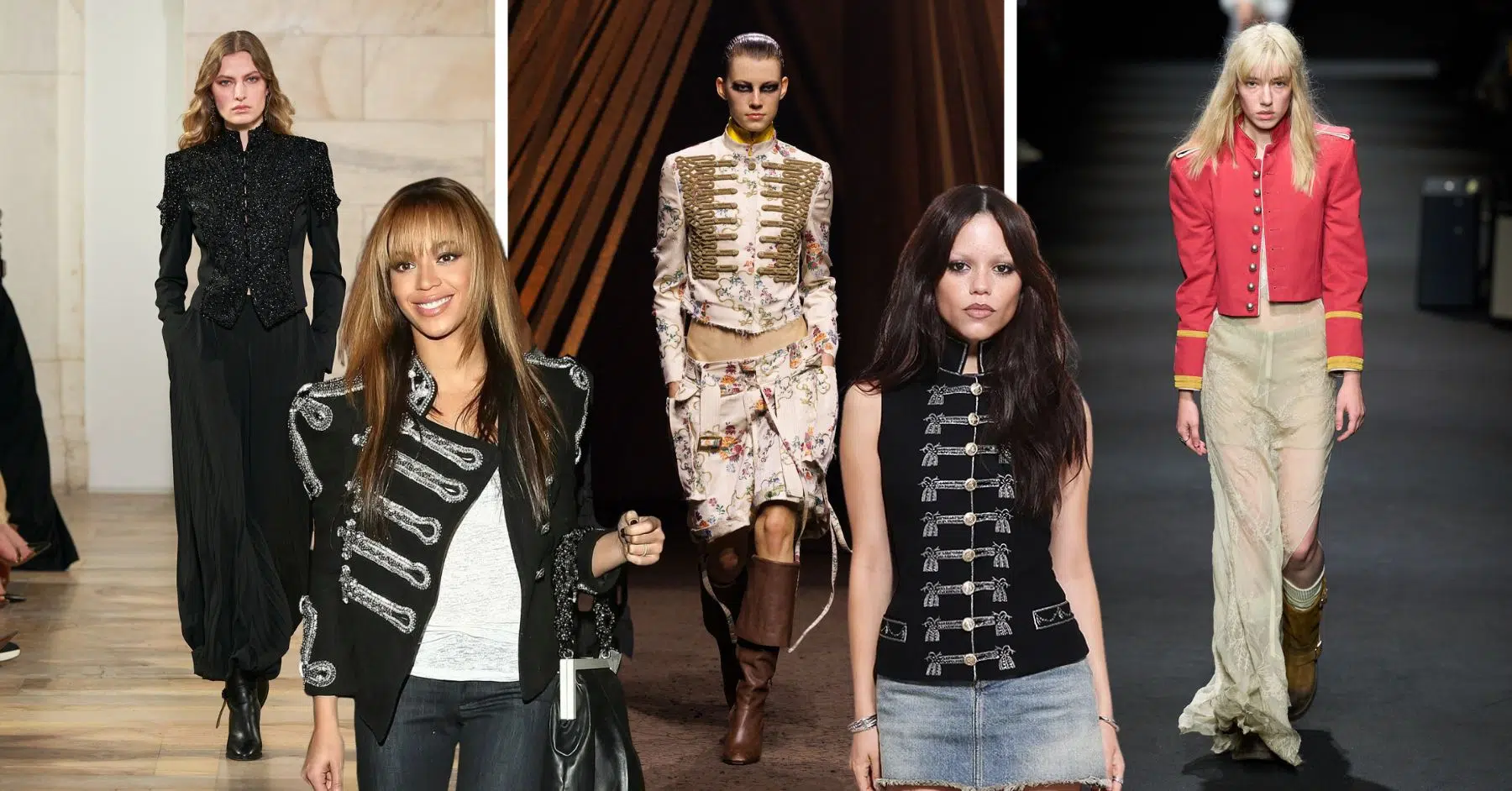 Kate Moss blijft een ijkpunt: haar slouchy manier van stylen geeft de huzarenjas een hedendaagse lichtheid. Denk aan faded denim, een vintage top of boots die al wat straten gezien hebben. Wie de look wil versterken, kiest voor een tweedehands exemplaar dat meteen karakter toevoegt.