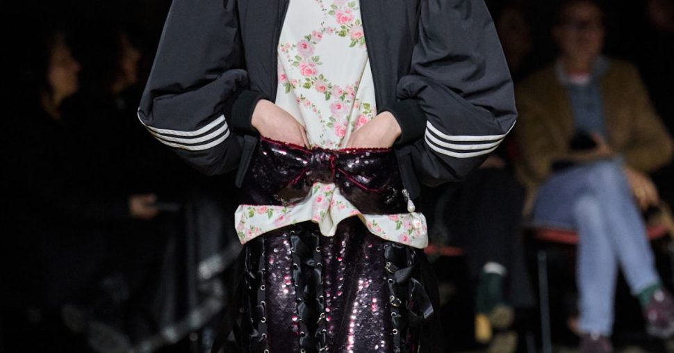 Bij Simone Rocha draaide FW26 om een sterk contrast tussen dromerigheid en rebellie. Denk: transparante lagen van tule gecombineerd met 90’s sportjasjes. Ook kreeg Rocha’s kenmerkende romantiek dit seizoen een donker randje, met diepe tinten rood en zwart kant en leer. Pareldetails en bloemenmotieven bleven aanwezig, maar dan net een tikje rauwer.