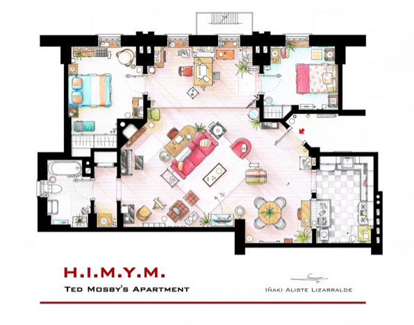 Hoe spreek je een TV-obsessie goed? Door die om te zetten in kunst! De Spaanse interieur ontwerpster Inaki Aliste Lizarralde schetste zo de plattegrond van de huizen waarin haar favoriete TV-personages wonen. De stekjes van Carrie Bradshaw (Sex and the City), Holy Gollightly (Breakfast at Tiffany’s, Ted Mosby (How I Met Your Mother) maar ook Mr. Frederickson (Up) hebben bij deze geen geheimen meer voor ons.