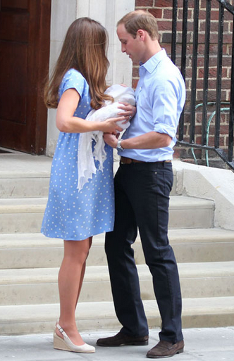 De hertogin draagt voor een blauwe polkadot jurk van Jenny Packham, een discrete ode aan haar schoonmoeder? Lady Diana verliet in 1982 immers hetzelfde ziekenhuis met de pasgeboren William in de armen, en dat in een soortgelijke jurk.